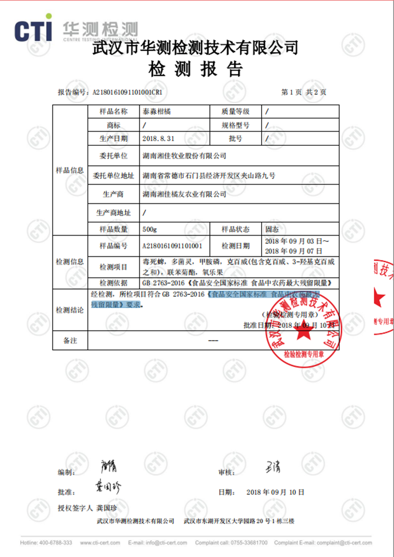 石門泰淼柑橘符合《食品安全國(guó)家標(biāo)準(zhǔn),食品中農(nóng)藥最大殘留限量》要求。