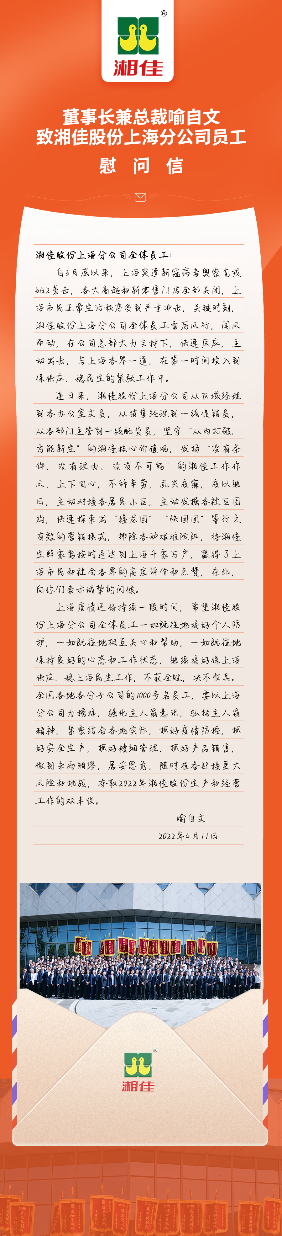 喻自文致湘佳股份上海分公司員工慰問信 發(fā)布人:文化部 發(fā)布日期:2022-04-11 5894次瀏覽 上一篇: 青春有我 筑夢湘佳|湘佳股份召開五四青年員工座談會 下一篇: 湘佳創(chuàng)業(yè)30周年慶祝大會:鳳領(lǐng)湘佳,五業(yè)齊飛